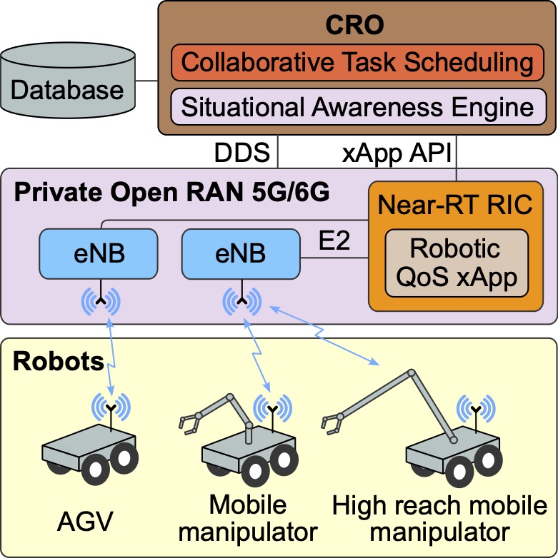 The new architecture integrates: Collaborative Robot Orchestration (CRO) for multi-robot task scheduling, a Private Open RAN 5G/6G providing low latency wireless communication with Quality of Service (QoS) enforcement, and Embedded Collaborative AI