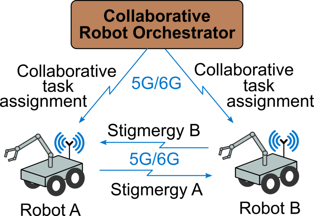 In this conceptual framework, the CRO investigates how a shared collaborative task can be assigned to a group of robots via wireless connectivity, including 5G and prospective 6G systems. After task assignment, robots may engage in direct inter-robot communication, potentially using the same wireless infrastructure to support coordination during task execution.